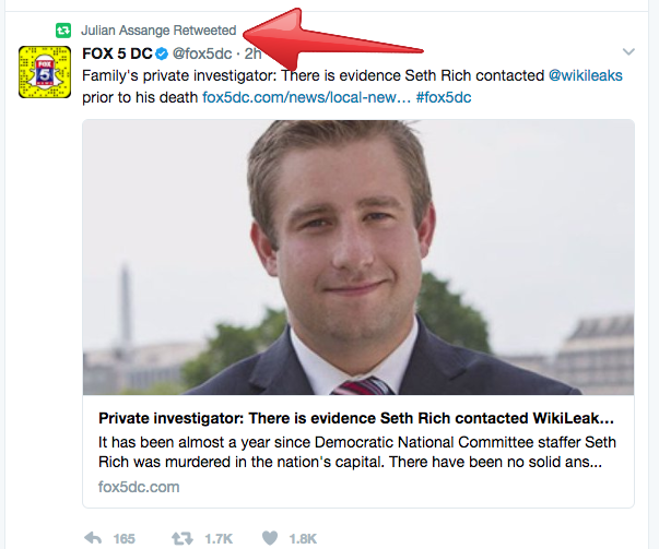Fox News has just corroborated with its own source a story that broke yesterday about a report from former DC homicide investigator Rod Wheeler, who has been working for Seth Rich’s family as a private investigator looking into the former DNC staffer’s murder. Both Wheeler’s sources and Fox News’ assert that Rich had been in contact with WikiLeaks leading up to his death, which casts the official story of his murder being the result of a random mugging into serious doubt for anyone who isn’t a glue-huffing imbecile. The Twitter accounts of both WikiLeaks and Julian Assangehave been tweeting about this story as well, if you needed a bit more convincing.